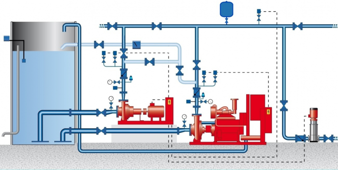 Son varios los sistemas que combaten el incendio mediante el aporte de agua: hidrantes, bocas de incendio equipadas con mangueras, agua pulverizada, rociadores, espumantes, etc. Así, se debe asegurar que llegue el agua a cada sistema en las condiciones necesarias para que su acción sea efectiva.